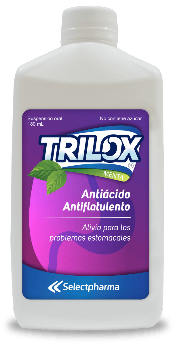 Trilox® es un medicamento de Selectpharma que combina hidróxido de aluminio, hidróxido de magnesio y simeticona, indicado para el alivio de la hiperacidez estomacal, gastritis, reflujo gastroesofágico y como coadyuvante en úlceras gástricas y gastroduodenales.